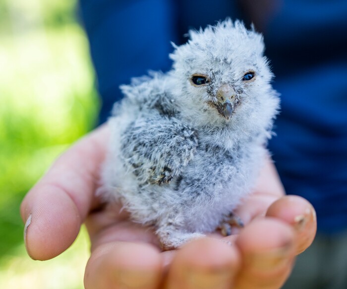 Each morning, Mika and his team drive out to the nest sites and check on the chicks. Using a contraption involving a pole and a baseball hat, Mika carefully covers the owl entrance hole to the wooden boxes as he opens up the top to gently hand the babies off. The conservationists and researchers working with him then measure wingspan and weigh them, noting any abnormalities, before putting them back in the nest. When they’re old enough, they will be tagged so the team can recognize returning owls.