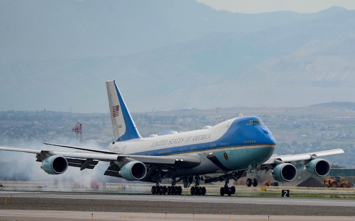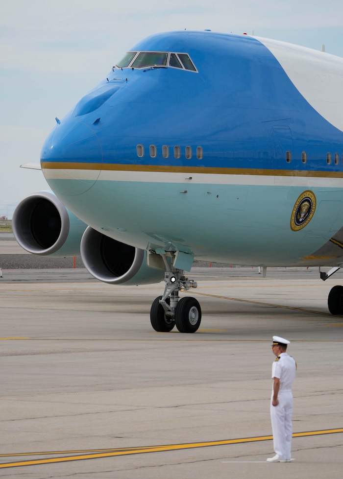 (Francisco Kjolseth | The Salt Lake Tribune) Air Force One lands at Roland R. Wright Air National Guard Base as President Joe Biden visits Utah on Wednesday, Aug. 9, 2023.