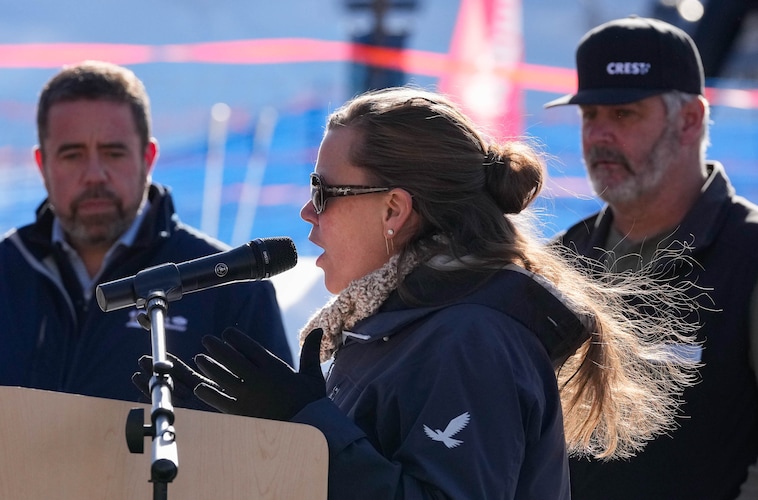 (Francisco Kjolseth | The Salt Lake Tribune) Amber Broadway, President and COO of Solitude joins representatives from Brighton, the Town of Brighton, UTA and Ski Utah as they gather at Solitude Mountain Resort on Wednesday, Dec. 6, 2023, to speak about the steps each organization is taking to reduce vehicle congestion in Big Cottonwood Canyon, and enhance the arrival experience.
