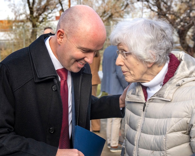 (Rick Egan | The Salt Lake Tribune) Gov. Spencer Cox visits with Pamela Atkinson in December 2023. Atkinson is calling on the state to change its Code Blue shelter law.