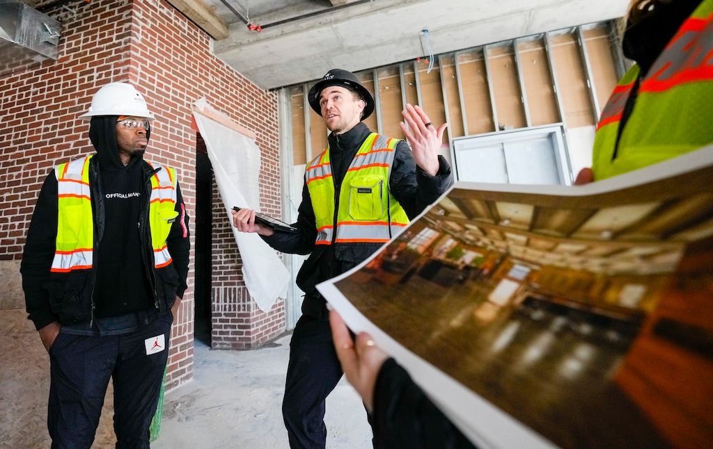 (Bethany Baker | The Salt Lake Tribune) Employees for Salt Lake Crossing, a new apartment complex set to open in downtown in May, give a tour at the construction site in downtown Salt Lake City on Friday, March 8, 2024.