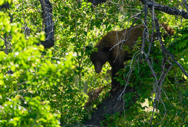 (Bethany Baker | The Salt Lake Tribune) A black bear stands in a tree in Salt Lake City on Wednesday, June 5, 2024.