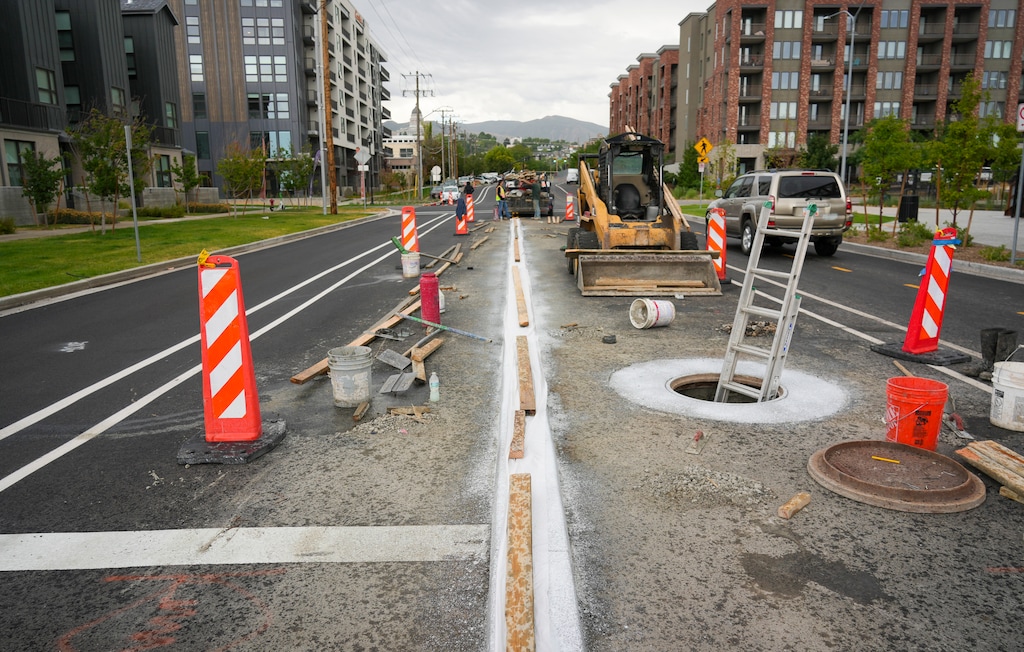 (Bethany Baker | The Salt Lake Tribune) Construction continues on 300 North as Salt Lake City upgrades the road to include a two-way bike lane, Wednesday, Aug. 14, 2024.