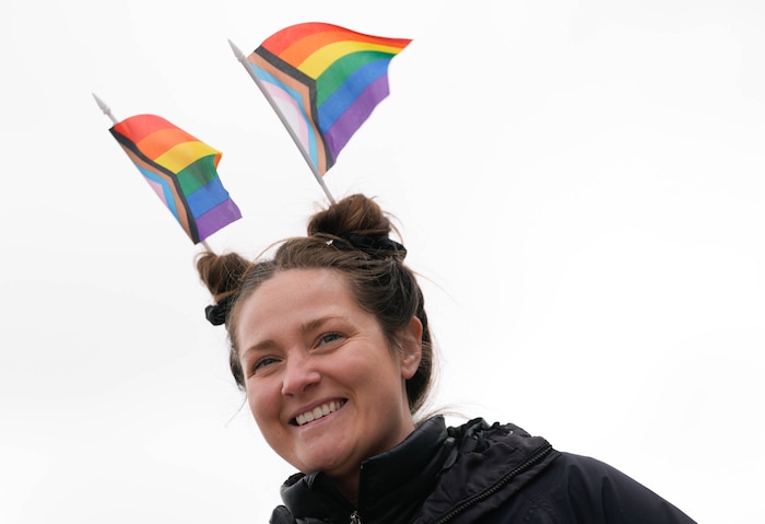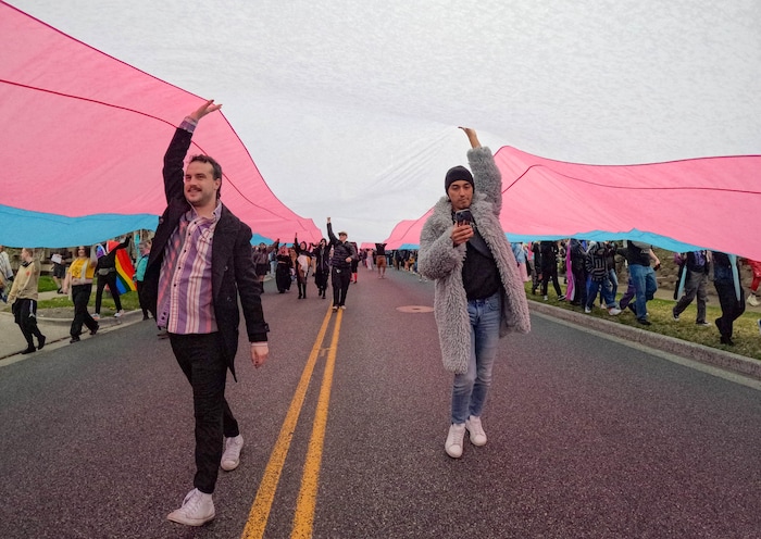 Many attendees draped pride flags on their backs like superhero capes. They held signs that said things like “People Over Politics” and “We won’t be erased.” Chants bellowed in the harsh wind: “Trans rights are human rights” and “Trans lives matter.”
