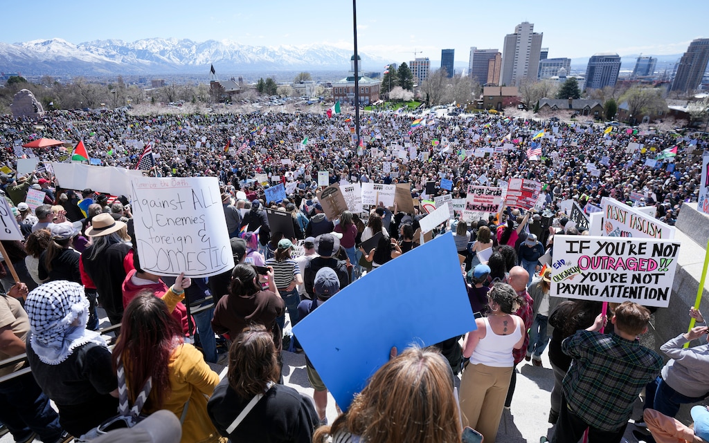 (Bethany Baker | The Salt Lake Tribune) Thousands of people gather during a protest against the Trump administration in Salt Lake City on Saturday, April 5, 2025.