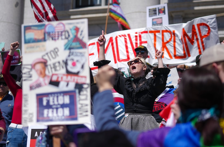 (Bethany Baker | The Salt Lake Tribune) A woman cheers during a protest against the Trump administration in Salt Lake City on Saturday, April 5, 2025.