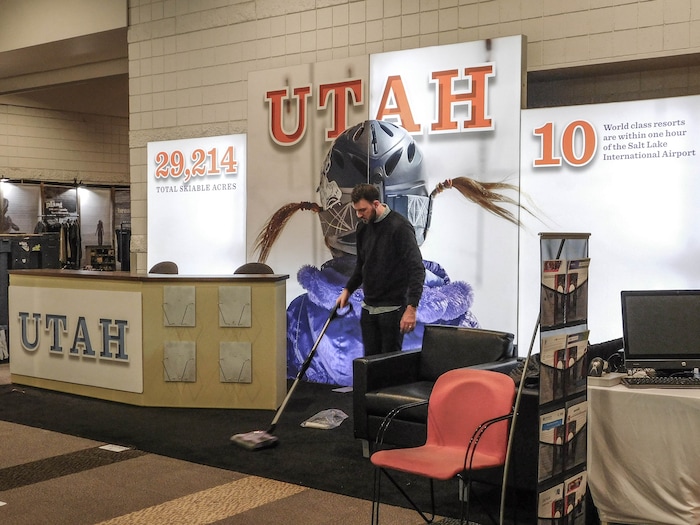 (Erin Alberty | The Salt Lake Tribune) Taylor Brightwell, marketing manager for the Economic Development Corporation of Utah, vacuums the EDC's booth on Wednesday night in preparation for the Outdoor Retailer winter show, which opens Thursday in Denver. The massive, twice-yearly Outdoor Retailer trade shows were held for 20 years in Salt Lake City; show organizers moved the show out of Utah in 2017 after disputes with state leaders over public lands policy.
