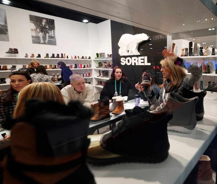 A salesperson pulls a shoe off a display in the Sorel booth at the opening of the Outdoor Retailers and Snow Show in the Colorado Convention Center, Thursday, Jan. 25, 2018, in Denver. Three floors of all the latest products for outdoor use makes the event the largest U.S. trade show for the outdoor and winter sports industries that represent $887 billion in sales. (AP Photo/David Zalubowski)
