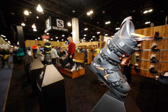 A ski boot appears on a display at the Salomon booth at the opening of the Outdoor Retailers and Snow Show in the Colorado Convention Center, Thursday, Jan. 25, 2018, in Denver. Three floors of all the latest products for outdoor use makes the event the largest U.S. trade show for the outdoor and winter sports industries that represent $887 billion in sales. (AP Photo/David Zalubowski)