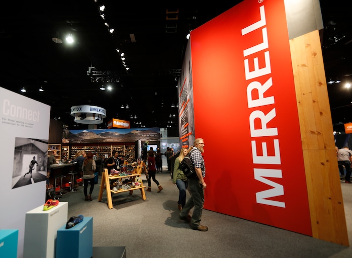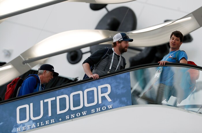Retailers exit the display for Merrell outdoor gear at the opening of the Outdoor Retailers and Snow Show in the Colorado Convention Center, Thursday, Jan. 25, 2018, in Denver. Three floors of all the latest products for outdoor use makes the event the largest U.S. trade show for the outdoor and winter sports industries that represent $887 billion in sales. (AP Photo/David Zalubowski)