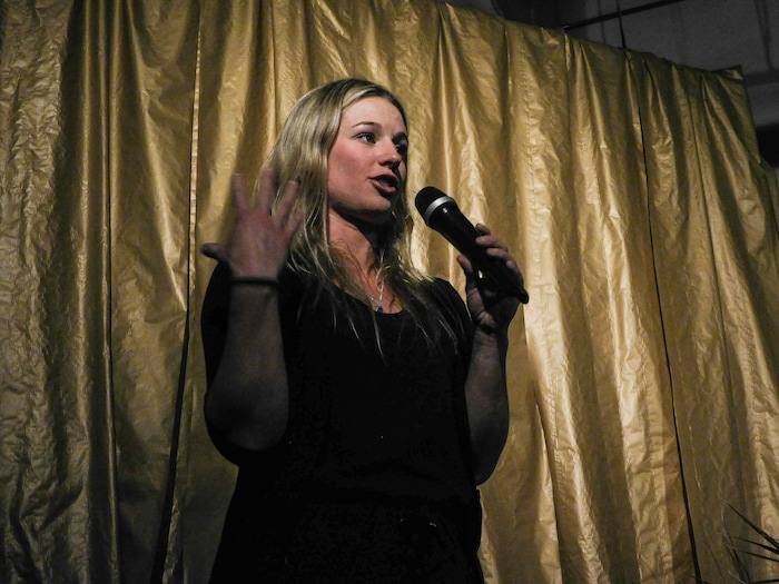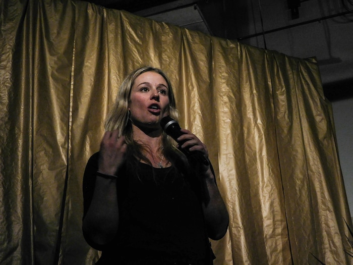(Erin Alberty | The Salt Lake Tribune) Renowned Utah ski mountaineer Caroline Gleich addresses conservationists and outdoor industry leaders at a party Wednesday night at the McNichols Civic Center in Denver to welcome the Outdoor Retailer show to Colorado. Organizers of the massive trade show ended its 20-year run in Utah in 2017 following disputes with state leaders over public lands policy. Gleich said the move was "bittersweet" but "a powerful move" in defense of conservation.