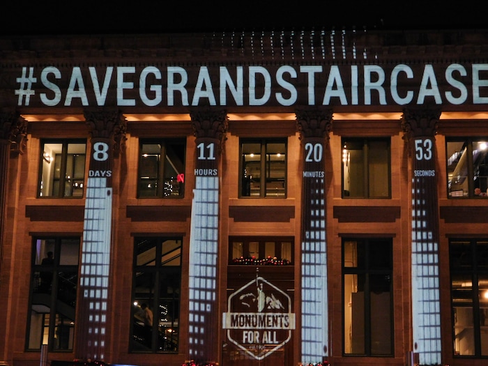 A countdown clock is projected on the side of the McNichols Civic Center building as guests arrive at a welcome party to mark the opening of the Outdoor Retailer and Snow Show Wednesday, Jan. 24, 2018, in downtown Denver. The show, which is the largest gathering in the United States for the $887 billion outdoor and winter sports industries, is making its Denver debut after leaving Salt Lake City, Utah. A group of outdoor industry leaders and conservation organizations projected the countdown clock in protest of President Donald Trump's recent removal of vast portions of Bears Ears and Grand Staircase Escalante national monuments in Utah, the largest ever elimination of protected areas in the history of the United States. (AP Photo/David Zalubowski)