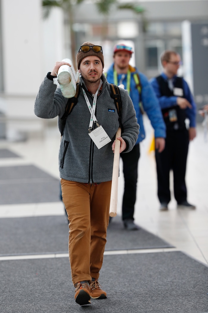 Dan Holmes, of Seattle, arrives at the Colorado Convention Center to set up for the Outdoor Retailer and Snow Show Wednesday, Jan. 24, 2018, in downtown Denver. The show, which is the largest gathering in the United States for outdoor and winter sports industries, is making its Denver debut after leaving Salt Lake City. (AP Photo/David Zalubowski)