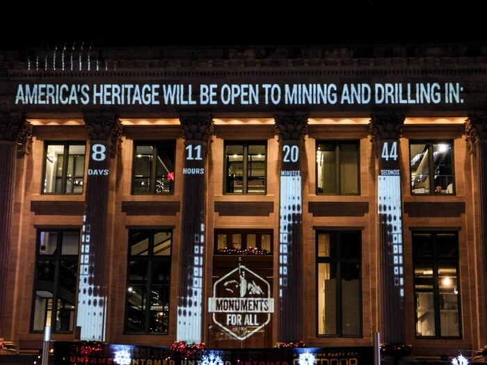 (Erin Alberty | The Salt Lake Tribune) A projection on Denver's civic center Wednesday night shows a countdown to when nominations for drilling leases may begin on lands formerly in Utah's Bears Ears & Grand Staircase-Escalante national monuments. Conservationists met at the civic center Wednesday night for a party welcoming the Outdoor Retailer show to Denver; organizers of the massive trade show ended its 20-year run in Utah in 2017 following disputes with state leaders over public lands policy.