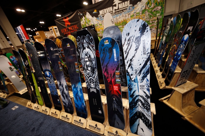 Snowboards are on display at the Mervin Made booth at the opening of the Outdoor Retailers and Snow Show in the Colorado Convention Center, Thursday, Jan. 25, 2018, in Denver. Three floors of all the latest products for outdoor use makes the event the largest U.S. trade show for the outdoor and winter sports industries that represent $887 billion in sales. (AP Photo/David Zalubowski)