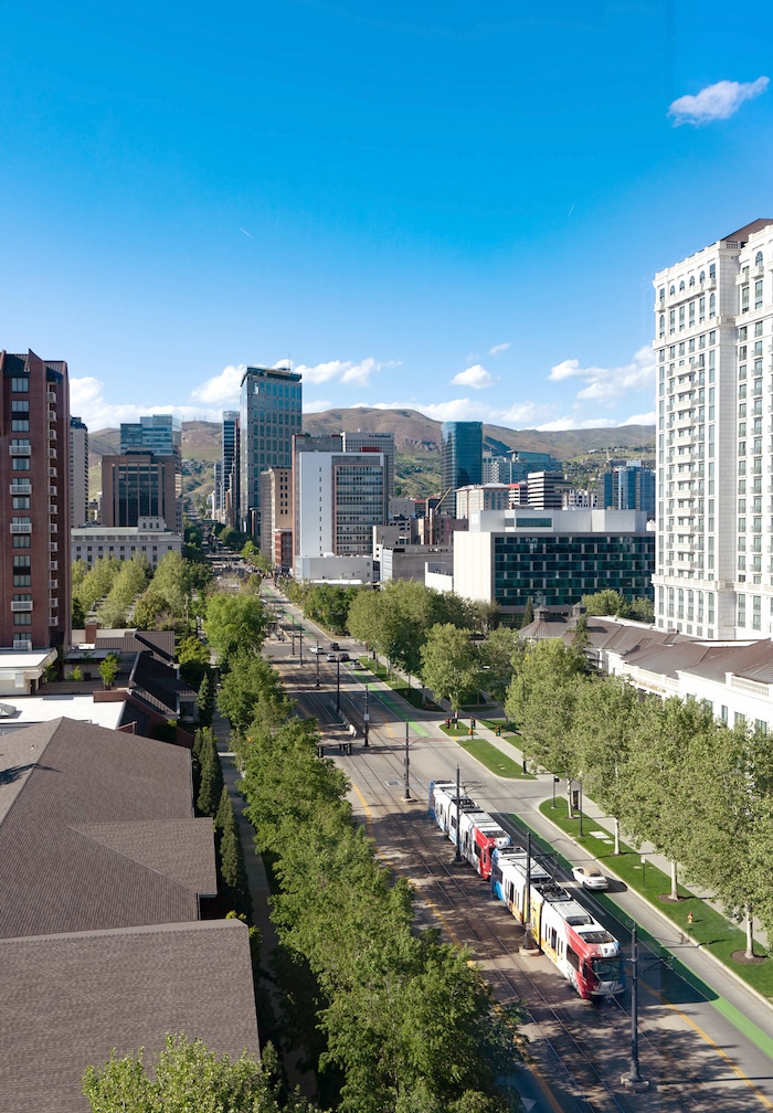 The glass-clad structure was designed by HOK, a worldwide firm headquartered in St. Louis. And in a special deal involving Salt Lake City and its Redevelopment Agency, the Utah Transit Authority is building a new TRAX station nearby.