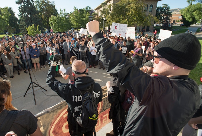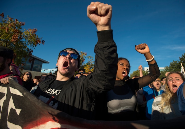 (Rick Egan | The Salt Lake Tribune) Protesters shout slogans on the University of Utah campus in Salt Lake City during a speech by Ben Shapiro is speaking, Wednesday, September 27, 2017.