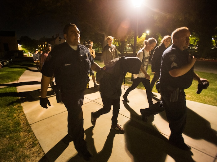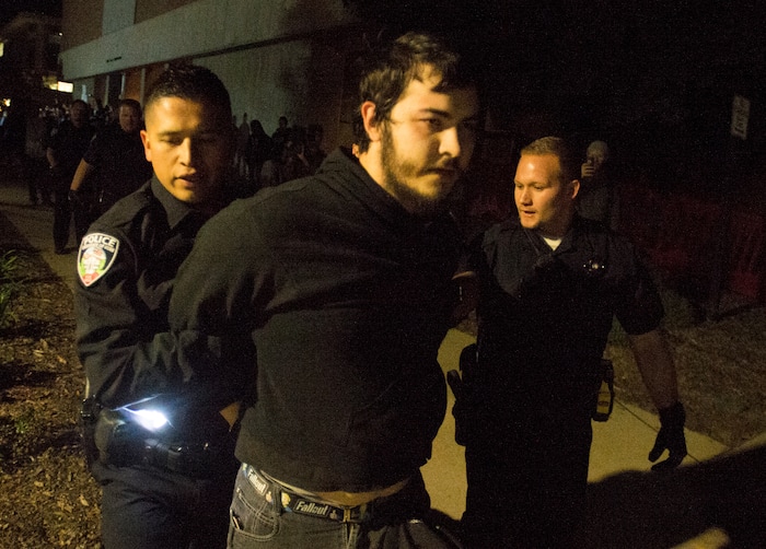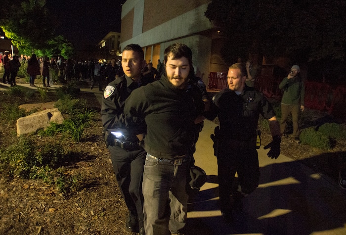 (Trent Nelson | The Salt Lake Tribune) Police arrest a man during an appearance by Ben Shapiro at the University of Utah in Salt Lake City, Wednesday September 27, 2017.