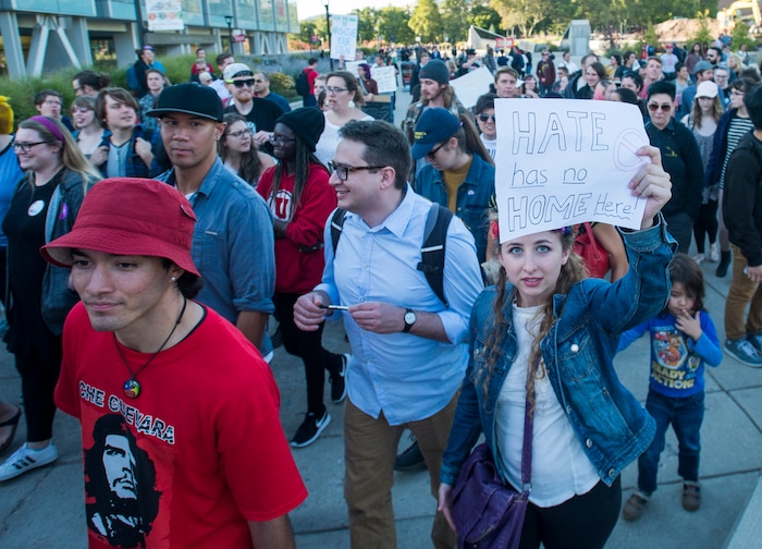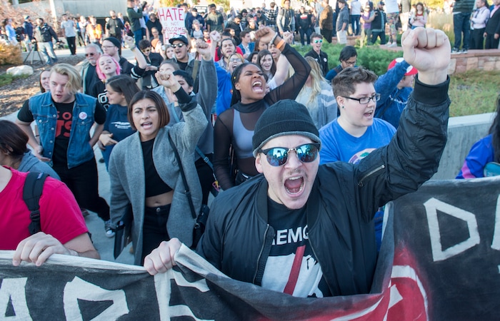 (Trent Nelson | The Salt Lake Tribune) A group of protesters rally against an appearance by Ben Shapiro at the University of Utah in Salt Lake City, Wednesday September 27, 2017.