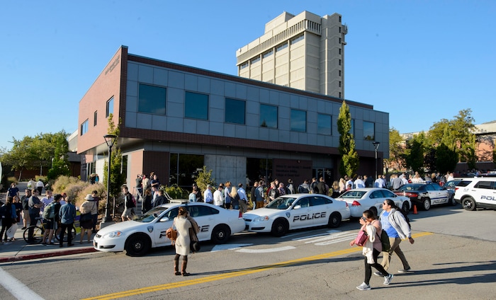 (Rick Egan | The Salt Lake Tribune) Police stand watch outside the building where Ben Shapiro is speaking on the campus of University of Utah, Wednesday, September 27, 2017.