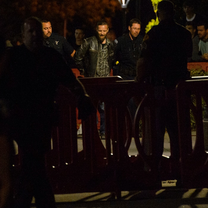 (Steve Griffin | The Salt Lake Tribune) Law enforcement officers detain a handcuffed man outside the speech conservative writer and commentator Ben Shapiro at the University of UtahÕs Social and Behavioral Sciences building in Salt Lake City Wednesday September 27, 2017.