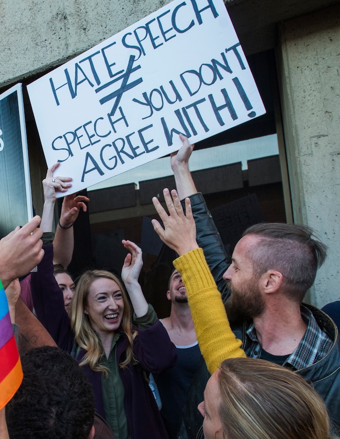 (Trent Nelson | The Salt Lake Tribune) A man holds a sign advocating for freedom of speech toward a group of protesters rallying against an appearance by Ben Shapiro at the University of Utah in Salt Lake City, Wednesday September 27, 2017.