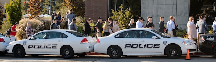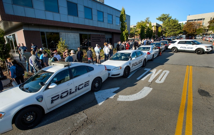 (Steve Griffin | The Salt Lake Tribune) Two rows of police vehicles form a barricade in front of ticket holders as they wait in line, for a security check, to hear conservative writer and commentator Ben Shapiro speak at the University of Utah's Social and Behavioral Sciences building in Salt Lake City Wednesday September 27, 2017.