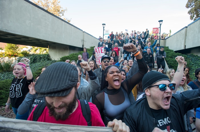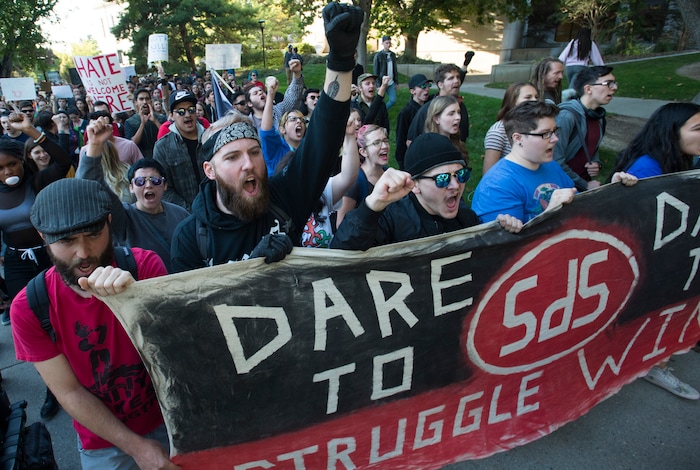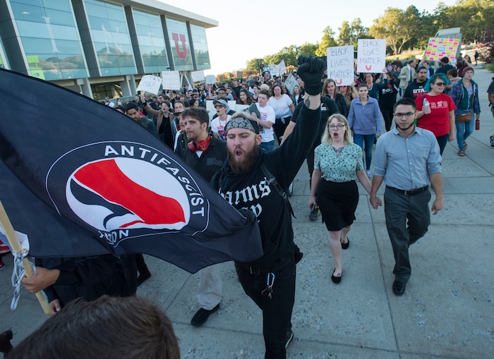 (Rick Egan | The Salt Lake Tribune) Protesters march across the University of Utah campus in Salt Lake City to protest Ben Shapiro's speech, Wednesday, September 27, 2017.