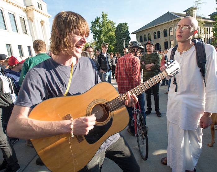 (Rick Egan | The Salt Lake Tribune) Kyler Watson, left, and Matsu sing Hare Krishna songs in front of the Park building, at the top of Presidents Circle on Wednesday, September 27, 2017.