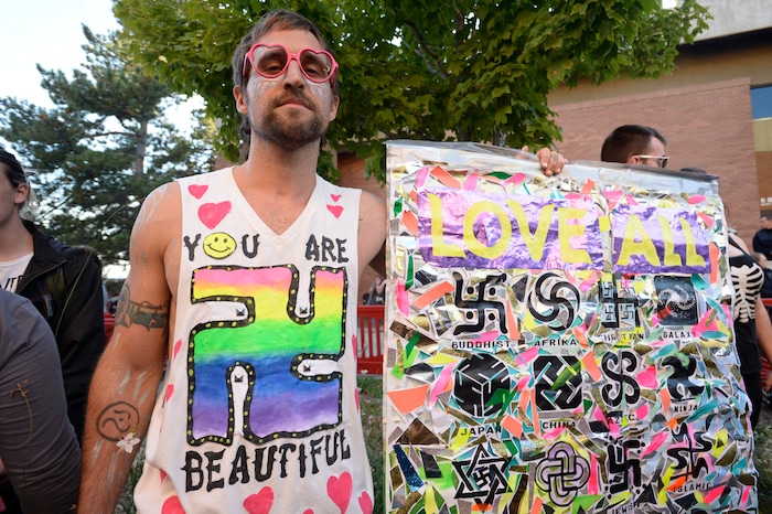 (Rick Egan | The Salt Lake Tribune) Sujinjin of Los Angeles, CA, came not to take sides but to preach love. Wednesday, September 27, 2017.