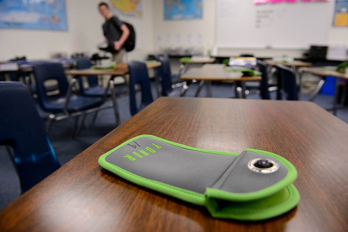 (Trent Nelson | The Salt Lake Tribune) Students in Monta Thomas' classes at Brighton High School in Cottonwood Heights secure their phones in locking pouches made by the company Yondr.