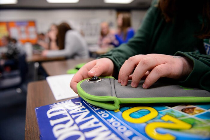As each student walks into class, he or she grabs a pouch, slides the phone in, snaps the lock shut, then sets it aside. When the bell rings at period’s end, the students swipe their pouches over an unlocking station, freeing the phones.