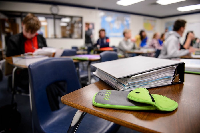 (Trent Nelson | The Salt Lake Tribune) Students in Monta Thomas's classes at Brighton High School in Cottonwood Heights secure their phones in locking pouches made by the company Yondr. Friday April 13, 2018.