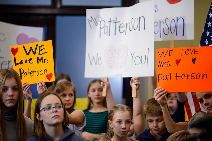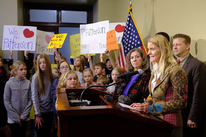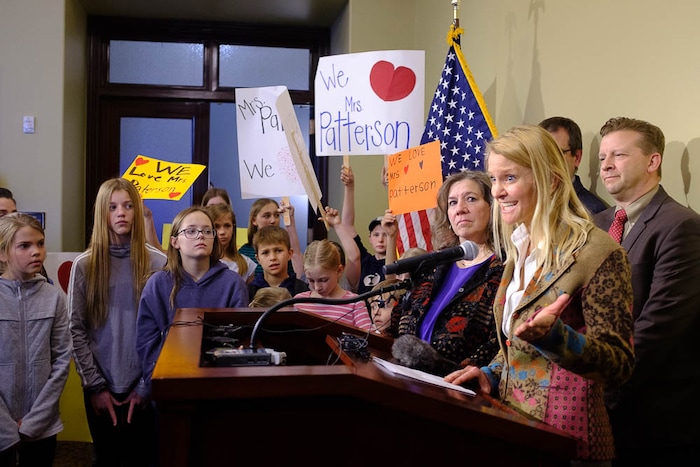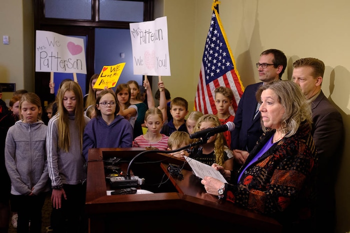 Standing around her were parents and students from Valley View Elementary School in Bountiful, an area in northern Utah that is predominantly home to members of The Church of Jesus Christ of Latter-day Saints. They held posters that said “We love Mrs. Patterson” with hearts drawn on them in marker. A few walked up to the microphone to defend her. Mostly, Patterson wanted to explain what she was thinking for the first time.