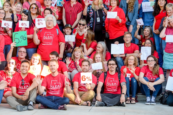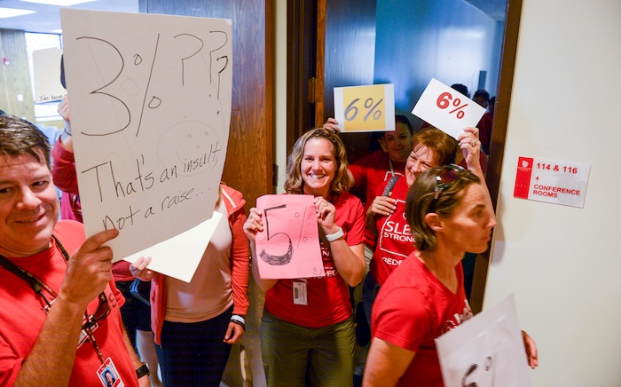 Many teachers, she said, stay late after school to help students and often grade papers from home. A lot of teachers also spend their own money on classroom supplies. She made her “6%” sign on a piece of red construction paper that she had to buy.