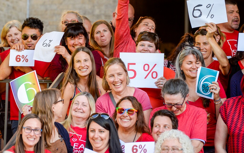 Teachers held their first protest in June, walking out of a board meeting on the night before the last day of school with signs that said “6%” — indicating the raise they wanted. They rallied again a few weeks later outside a district meeting, chanting: “Cut our funding, and we’ll go job hunting.”