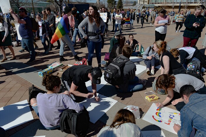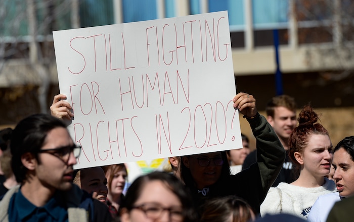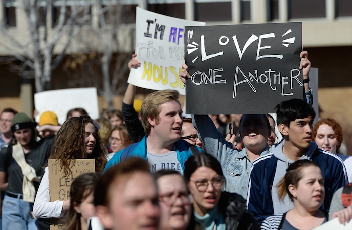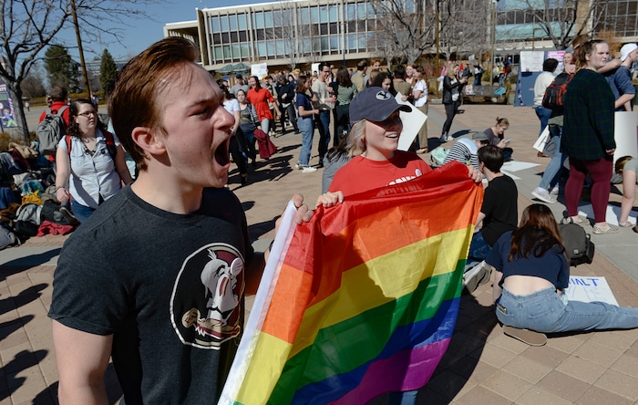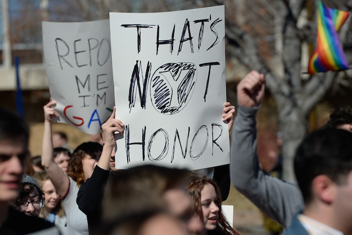 In the afternoon, hundreds of students met in the campus quad to protest what they saw as a painful reversal by BYU. They solemnly sang church hymns and marched in a circle. One person clung to a poster that read, “Jesus said love everyone." And they chanted together, “The Honor Code is honor-less."