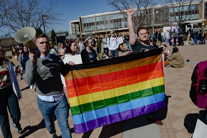 Galbraith helped organize the rally on campus Wednesday. Nearly 1,000 students marched with rainbow flags for three hours. At the start, they quietly chorused together: “As I have loved you, love one another.”