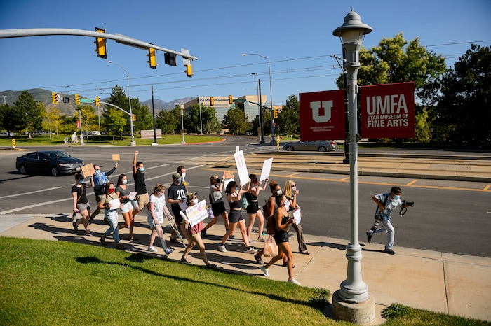 (Trent Nelson | The Salt Lake Tribune) Students protest on the University of Utah campus in Salt Lake City on Thursday, Aug. 6, 2020. They are calling for action against Officer Miguel Deras and the defunding of the University of Utah Police Department.