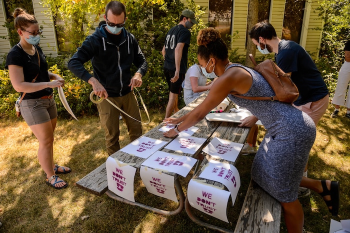 (Trent Nelson | The Salt Lake Tribune) Students protest at the University of Utah Police Department in Salt Lake City on Thursday, Aug. 6, 2020. They are calling for action against Officer Miguel Deras and the defunding of the police department.