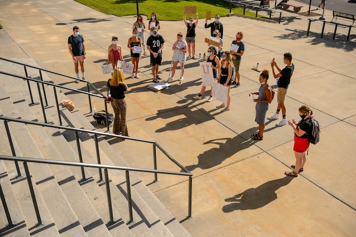 About 20 people participated in the protest, largely members of the student group Unsafe U., as well as two of McCluskey’s former track teammates.