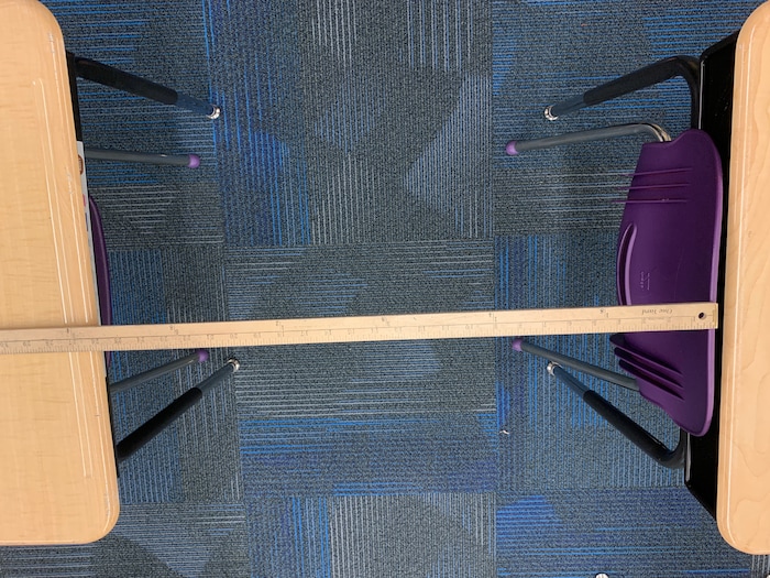 After moving the desks over and over, the most distance she could get side-to-side was 20 inches. “It’s not even 2 feet between them,” Jones said. And there’s 26 inches from the back of one chair to the front of the desk behind it.