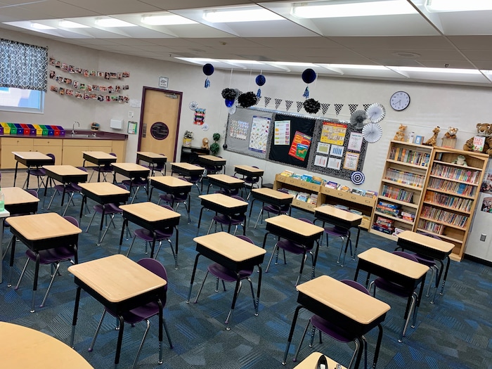 She’s still working to arrange them, but she’s getting close. When she first got into her new room at Southland Elementary in Jordan School District, there was just 17 inches. After removing a few desks for the students who would be working online and pulling out some extra furniture, she’s got between 2.5 and 3 feet around each desk.