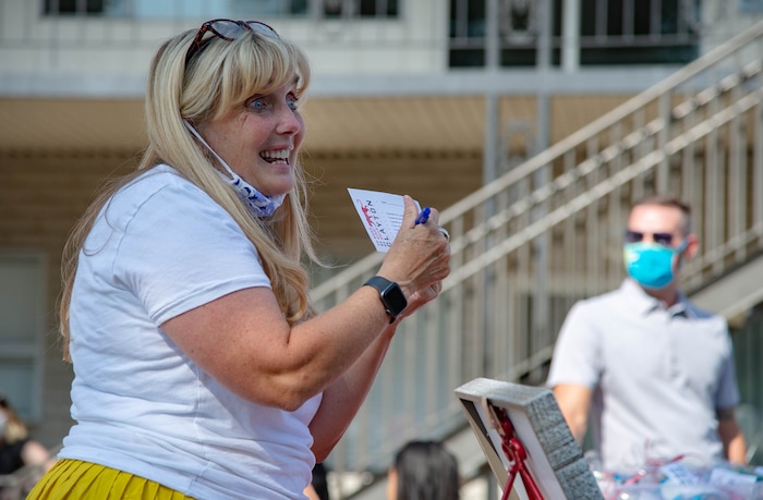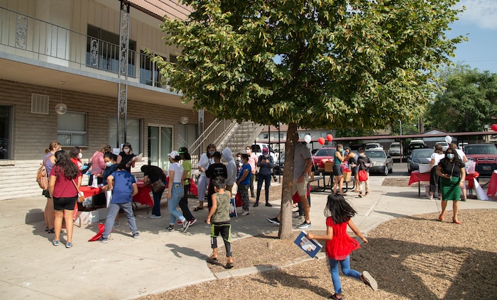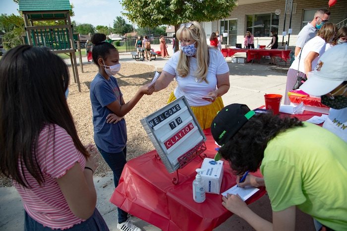 Stephanie Hunt, an English language development teacher at Clayton Middle School, stood outside the apartments and guided students through the process of registering. Nine other staffers were there to help, including some translators. Everyone wore masks.