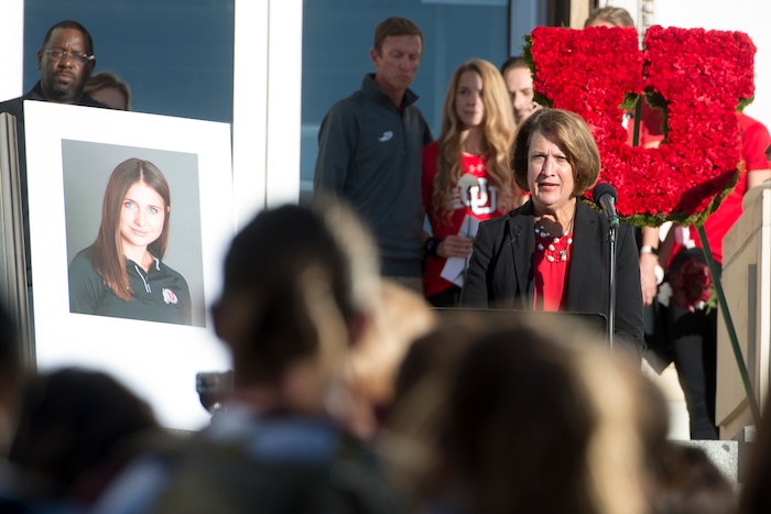 (Jeremy Harmon | The Salt Lake Tribune) University of Utah President Ruth Watkins speaks during a vigil for Lauren McCluskey on Wed. Oct 24, 2018. McCluskey was killed on campus on Monday. Watkins announced Tuesday, Jan 12, 2021 that she is stepping down and has accepted a post to lead Strada Impact, a national education program focused on getting students to complete college.
