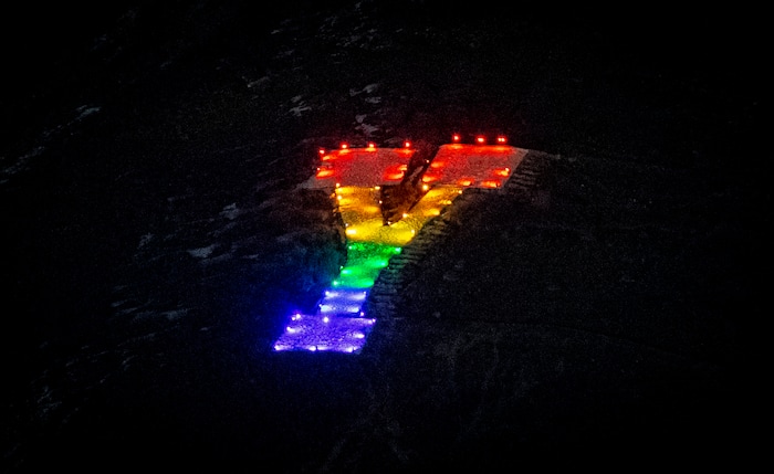 (Trent Nelson | The Salt Lake Tribune) A group of people, including many BYU students, shine Pride colors on the Y on the mountain above BYU in Provo on Thursday, March 4, 2021.