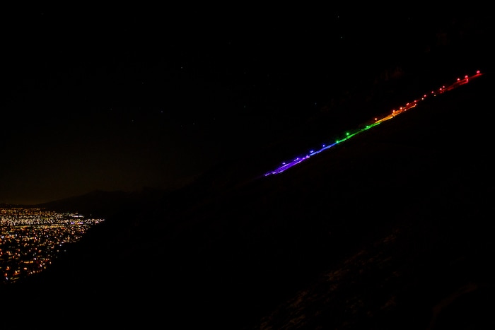 The participants were assigned a color and a spot on the “Y” to hold their light so that the letter would appear in rainbow stripes from red at the top to purple at the bottom. When they turned on the flashlights — 76 in total — and turned them toward the concrete, the result could be seen across Provo, with people commenting and posting pictures on social media from miles away.