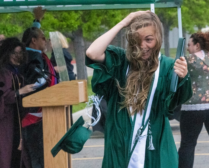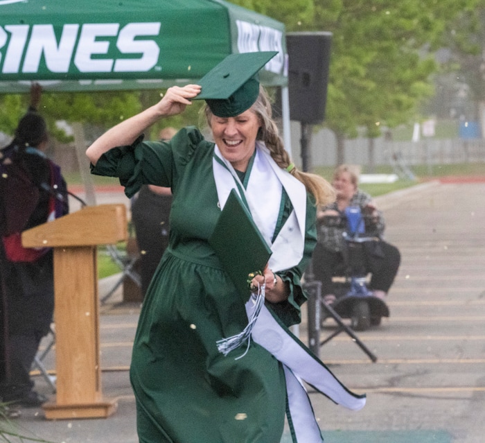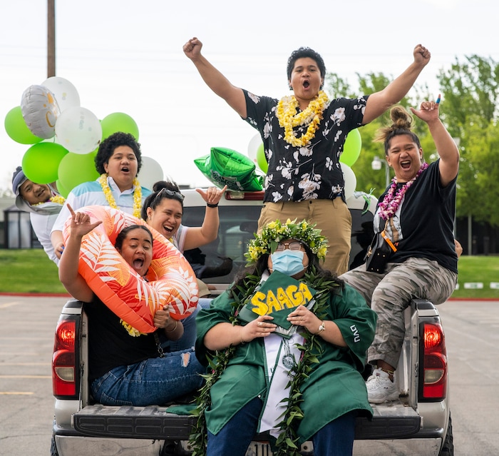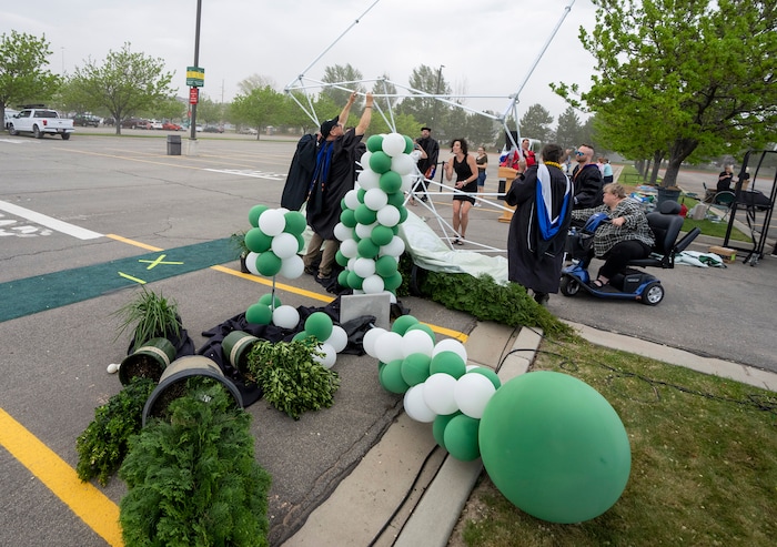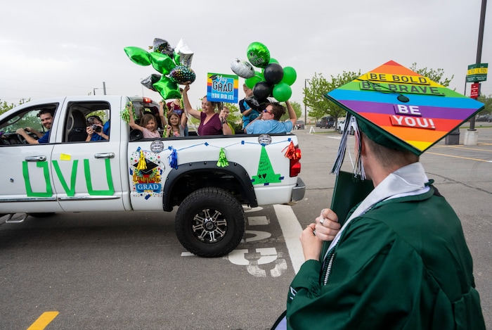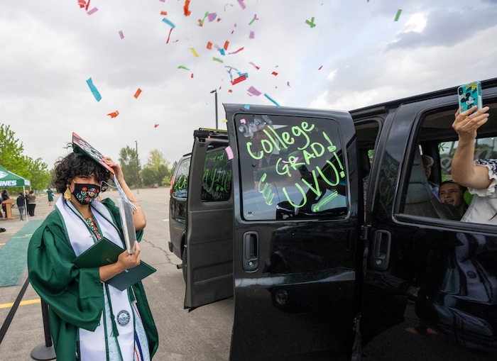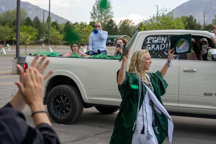 The small audience in the auditorium at Utah Valley in Orem laughed. The ceremony was supposed to be outside, due to COVID-19 precautions, where graduates could drive in, park by the stage and listen. But high winds forced some late pivoting. Many still tuned in from their cars as massive screens displayed the speeches into the parking lots and the radio carried the sound on a special station.