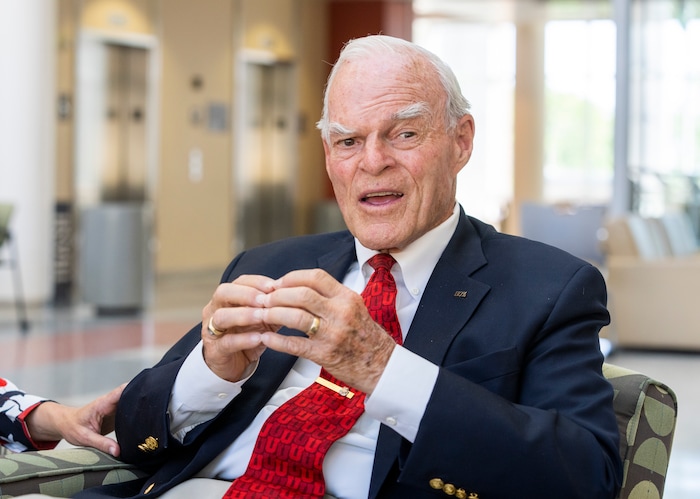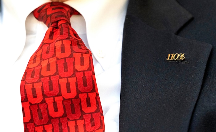 (Rick Egan | The Salt Lake Tribune) Spence Eccles still wears the 110% pin from First Security Bank, on his lapel, on Tuesday, June 8, 2021.