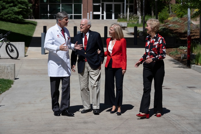 (Rick Egan | The Salt Lake Tribune) Katie Eccles, Lisa Eccles, Spence Eccles, listen as Michael L. Good, MD, CEO, University of Utah Health Dean, University of Utah School of Medicine Senior Vice-President for Health Sciences, talks about the U of U Medical campus, where a donation in the name of Spence Eccles was announced, Tuesday, June 8, 2021.